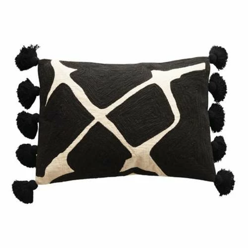 Catalog Name: 26″L x 18″H Cotton Embroidered Lumbar Pillow w/ Tassels, Black & White